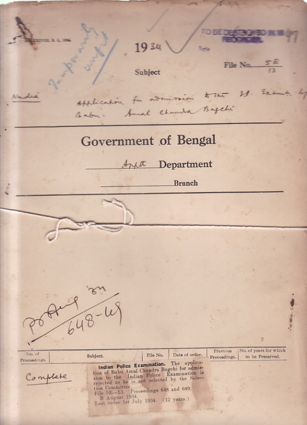 | Rack No. 02, Bundle No. 13, Sl No. 828 Employment of women in service. | Rack No. 02, Bundle No. 13, Sl No. 829 Proposed transfer of live Junior Indian Civil Service officers from the Central Provinces to other province. | Rack No. 02, Bundle No. 13, Sl No. 830 Withdrawal of provident Fund Deposits for payment of insurance premium on pure endowment polices. | Rack No. 02, Bundle No. 13, Sl No. 831 Application for admission to the I.P. Examination by Babu Amal Chandra Bagchi. | Rack No. 02, Bundle No. 13, Sl No. 832 Application of Maulvi Syed Abu Daud Fakhruddin Ahmed for admission to the I.P. Examination. | Rack No. 02, Bundle No. 13, Sl No. 833 Application of Maulvi. Khalekur Rahman Khundakar for admission to the I.P. Examination. | Rack No. 02, Bundle No. 13, Sl No. 834 Application of Babu Ranendra Chandra Guha for admission to the I.P. Examination. |