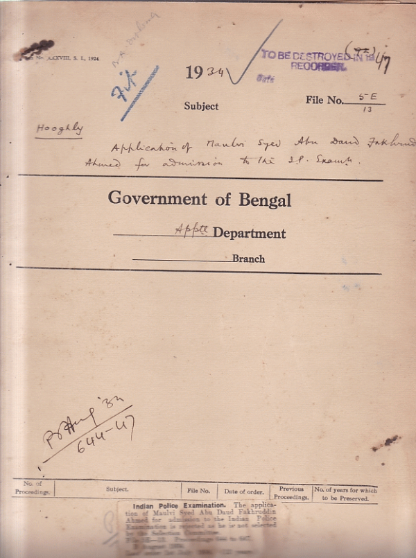 Application of Maulvi Syed Abu Daud Fakhruddin Ahmed for admission to the I.P. Examination.