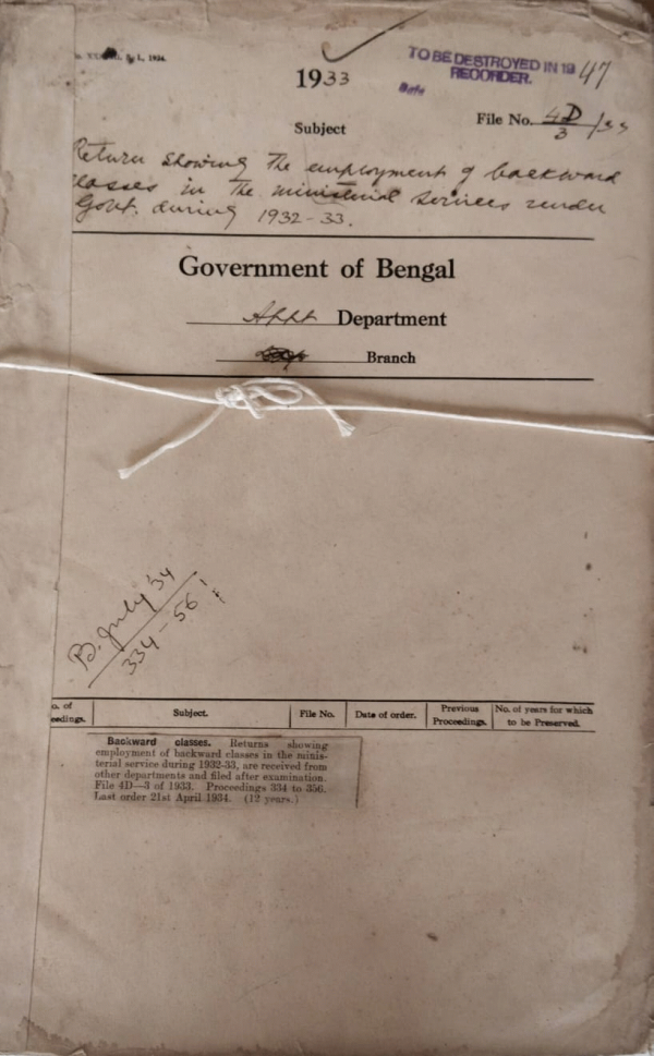 | Rack No. 2, Bundle No. 8, Sl No. 488 Appointment of M.A.E. Porter I.C.S, of Rural Development Corporation, Bengal. | Rack No. 2, Bundle No. 8, Sl No. 489 Payment for the use of Railway Warrants and Credit notes. | Rack No. 2, Bundle No. 8, Sl No. 490 T.A. of Khan Bahadur A.F.M. Abdur Rahman M.L.C. a member of the I.P. Selection Committee | Rack No. 2, Bundle No. 9, Sl No. 491 Returns showing the employment of backward classes in the Ministerial Service under Government During 1932-33. | Rack No. 2, Bundle No. 9, Sl No. 492 Travelling allowance of Lt. P.H.B. Hickman and captain W.G. Barker in connection with their Journeys to join the E.F.R. | Rack No. 2, Bundle No. 9, Sl No. 493 Requisition of the Government for copies of Rules framed by under the Classification rules. | Rack No. 2, Bundle No. 9, Sl No. 494 Hot weather postings of I.C.S. officers (India). |