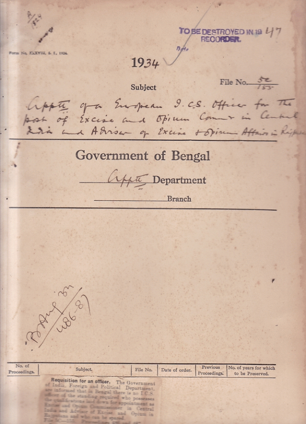 Appointment of a European I.C.S. officer for the past of Excise and opium commissioner in central India and Adviser on Excise and opium Affairs in Rajputana.