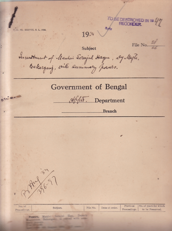 Encasement of Maulvi. Serajul Haque Deputy Magistrate Bakarganj with Summary powers.
