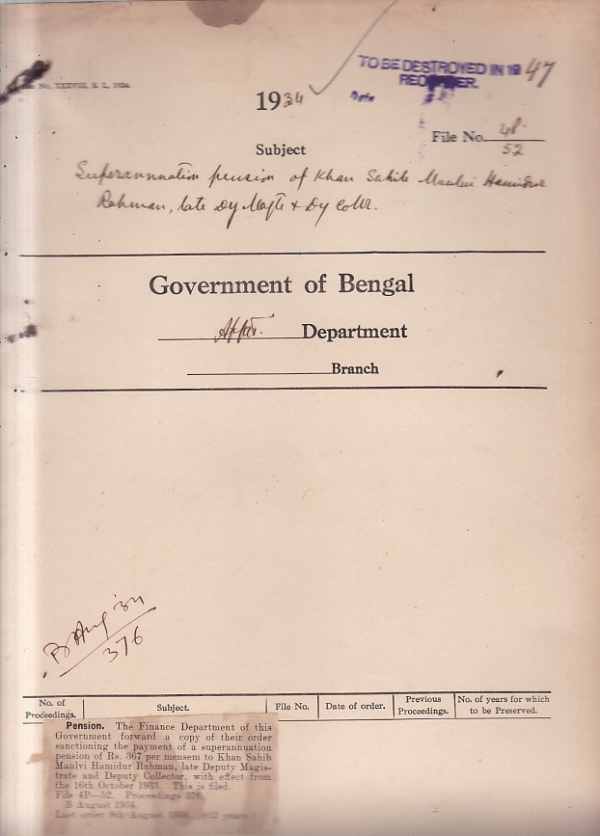 Superannuation pension of Khan Sahib Maulvi Hamidur Rahman late Deputy Magistrate and Deputy Collector.