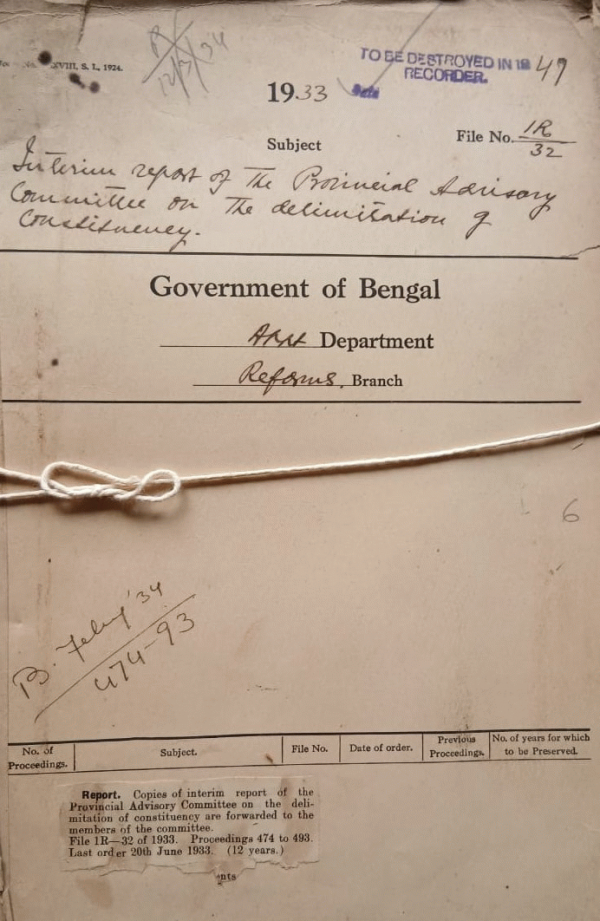 | Rack No. 2, Bundle No. 03, Sl No. 198 Proposed discontinuance of compulsory subscription to provident Fund. | Rack No. 2, Bundle No. 03, Sl No. 199 Payment of railway fare to Mv. F.P. Mckinty, I.P. of the Indian Police, retired on proportionate pension. | Rack No. 2, Bundle No. 03, Sl No. 200 Payment of arrear pays to khan Sahib Molvi. Ali Azam, Deputy Magistrate any Deputy Collector. | Rack No. 2, Bundle No. 03, Sl No. 206 Interim report of the provincial Advisory committee on delimitate of Constituency. | Rack No. 2, Bundle No. 04, Sl No. 201 Deputation of a sub-deputy Collector for the annual verification of the stock of stamps in the Reserve stamps Depot. | Rack No. 2, Bundle No. 04, Sl No. 202 Annual return of officers, who have been enrolled in the A.I.R.O up to December, 1933. | Rack No. 2, Bundle No. 04, Sl No. 203 Application for a loan for the widow of the late Babu Kamakshya Prosed Sen, Sub-Deputy Collector |