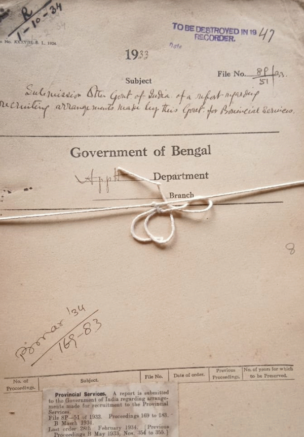 | Rack No. 2, Bundle No. 04, Sl No. 204 Request for posting a Jt. Magistrate to Bakarganj. | Rack No. 2, Bundle No. 04, Sl No. 205 Reports of the provincials Advisory Committees of the provinces. | Rack No. 2, Bundle No. 04, Sl No. 207 Nominations for promotion of offers of the Bengal Junior Civil Service to the B.C.S. (Ex.). | Rack No. 2, Bundle No. 04, Sl No. 208 Submission of the Government of India of a report regarding recruitment arrangement made by this Government for provincial Services. | Rack No. 2, Bundle No. 04, Sl No. 209 Grant of an honorarium to J.M. Mitra Government report police Department for reporting the meeting of the provincial Advisory Committee. | Rack No. 2, Bundle No. 04, Sl No. 210 Advisory committee Enquiry by the High Court as to the Poling follower by Governmentin filling listed posts. | Rack No. 2, Bundle No. 04, Sl No. 211 Extension of the appointment of Mr. J.B. Bird, I.C.S. Special officer, Finance Department. |