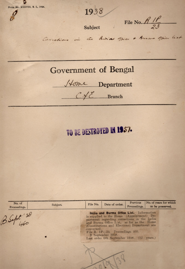 | Rack No. 08, Bundle No. 06, SI No. 312 Participation of Govt. Servants in elections. | Rack No. 08, Bundle No. 06, SI No. 313 Revised rules regarding the hoisting of flags on Govt. buildings. | Rack No. 08, Bundle No. 06, SI No. 314 General provident fund Rules sent to the Bengal Legislative Assembly. | Rack No. 08, Bundle No. 06, SI No. 315 Correction in the India & Burma office list. | Rack No. 08, Bundle No. 06, SI No. 316 Statement of grant or appropriation & expenditure for grant no. 11 General Administration 1937-38. | Rack No. 08, Bundle No. 06, SI No. 317 Administration of govt. servants to the Auxiliary Force (India). | Rack No. 08, Bundle No. 06, SI No. 318 Controlling officers in respect of the T.O. bills of officers & staff of the B.L.A. & the B.L.C. |