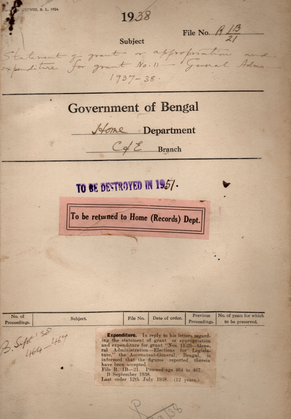 | Rack No. 08, Bundle No. 06, SI No. 313 Revised rules regarding the hoisting of flags on Govt. buildings. | Rack No. 08, Bundle No. 06, SI No. 314 General provident fund Rules sent to the Bengal Legislative Assembly. | Rack No. 08, Bundle No. 06, SI No. 315 Correction in the India & Burma office list. | Rack No. 08, Bundle No. 06, SI No. 316 Statement of grant or appropriation & expenditure for grant no. 11 General Administration 1937-38. | Rack No. 08, Bundle No. 06, SI No. 317 Administration of govt. servants to the Auxiliary Force (India). | Rack No. 08, Bundle No. 06, SI No. 318 Controlling officers in respect of the T.O. bills of officers & staff of the B.L.A. & the B.L.C. | Rack No. 08, Bundle No. 06, SI No. 319 Procedure for the Hans mission of council questions to the administration department. |