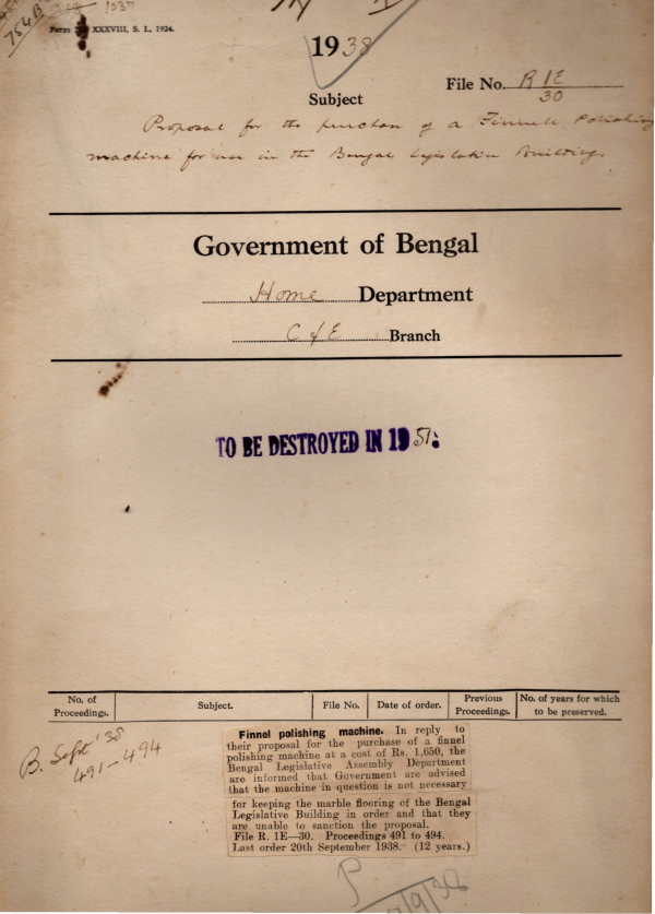 | Rack No. 08, Bundle No. 06, SI No. 324 Government service Debarring Suresh Chandra Singha Roy from obtaining any appointment under Govt. | Rack No. 08, Bundle No. 06, SI No. 325 Position of the Honorable Speaker in relation to the legislative assembly staff. | Rack No. 08, Bundle No. 06, SI No. 326 Purchase of Un-repealed Central Acts Revised Edition. | Rack No. 08, Bundle No. 06, SI No. 327 Proposal for the purchase of a Fennel Polishing machine for use in the Bengal Legislative Building. | Rack No. 08, Bundle No. 06, SI No. 328 Representation of Buddhists of Bengal in the provincial Legislature. | Rack No. 08, Bundle No. 06, SI No. 329 Standardized forms for the maintenance of Pro-forma account of local contribution. | Rack No. 08, Bundle No. 06, SI No. 330 Change in the designation of the Law & Commerce Department of the Govt. of Orissa to Law & Commerce & Labour Department. |