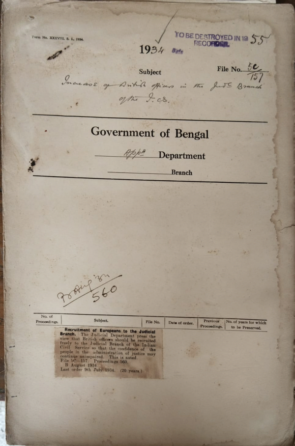 | Rack No. 2, Bundle No. 9, Sl No. 528 Grant of leave after the date of compulsory retirement. | Rack No. 2, Bundle No. 9, Sl No. 529 Application of Babu Sudhasu Bhusan Sen for admission to the Indian Police Examination. | Rack No. 2, Bundle No. 9, Sl No. 530 Application of Maulvi Raqibul Haque for admission to the Indian Police Examination | Rack No. 2, Bundle No. 9, Sl No. 531 Indian as Europeans and British officers in the judicial Bench of the I.C.S. | Rack No. 2, Bundle No. 9, Sl No. 532 Third Class powers of Babu Jitendra Nath Guna, Sub-Deputy Collector Murshidabad. | Rack No. 2, Bundle No. 9, Sl No. 533 Pension of Rai Jatindra Mohan Banarji Bahadur late Magistrate and collector. | Rack No. 2, Bundle No. 9, Sl No. 534 Posting of Deputy Magistrate and Deputy Collector on Probation Appointment by promotion from the Bengal Indian Civil service. |