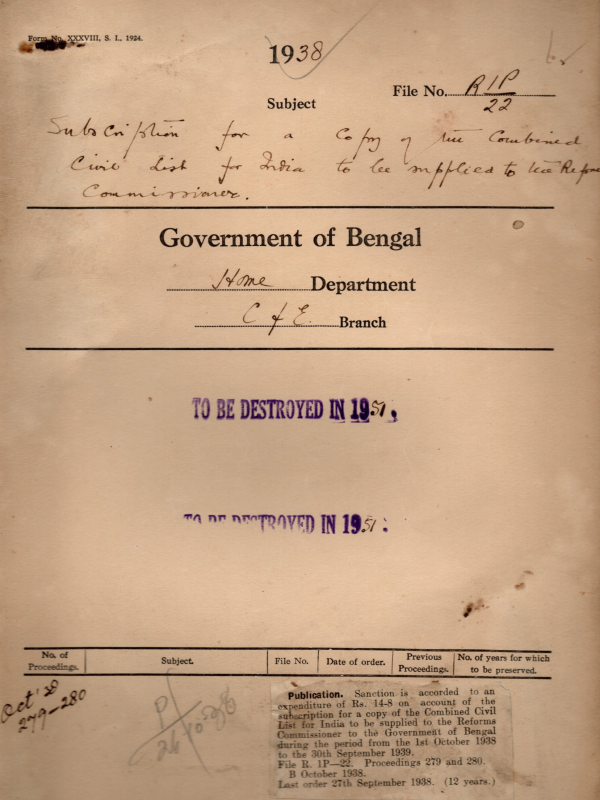 Subscription for a copy of the combined civil list for India to be supplied to the Reforms Commissioner.