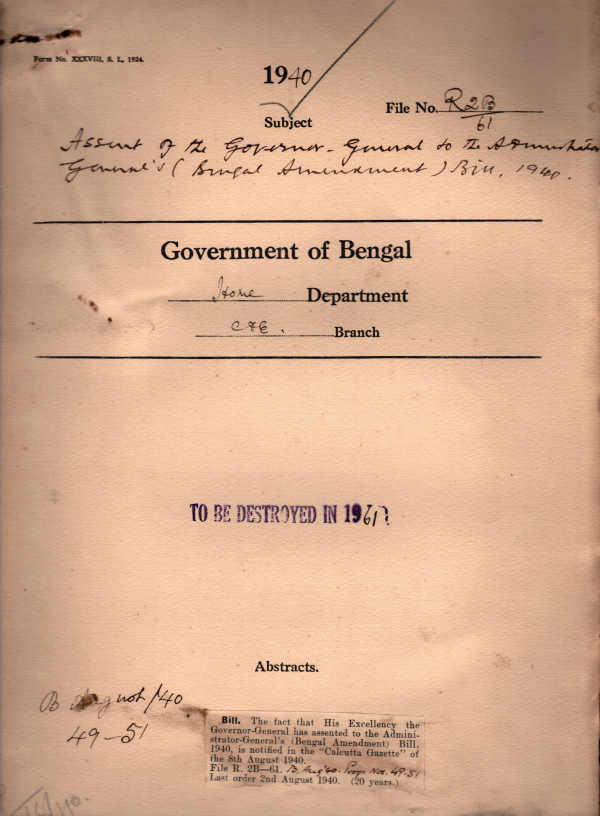 Assent of the Governor general to the Administrator general’s (Bengal Amendment) Bill, 1940.
