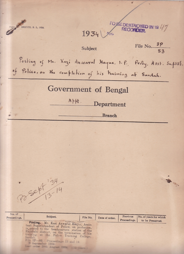 Posting of Mr. Kazi Anwarul Haque I.P.A. Superintendent of police of the completion of his training at Sardar.