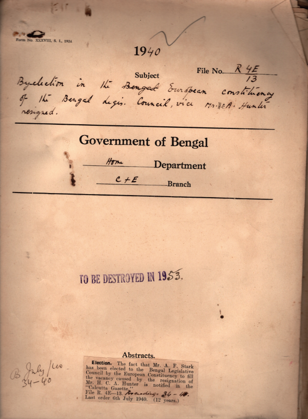 Bye-election in the Bengal European constituency of the Bengal Legislative Council Vice Mr. H.C.A. Hunter resigned.