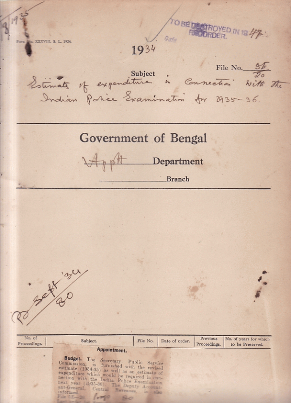 | Rack No. 02, Bundle No. 14, Sl No. 866 Allotment of the Candidates successful at the I.C.S. Exam held at Delhi in 1934. | Rack No. 02, Bundle No. 14, Sl No. 867 Pay of Mr. A. Dec. Williams I.C.S. Secretary Legislative department who has appointed. | Rack No. 02, Bundle No. 14, Sl No. 868 Retirement on invalid pension, Babu Phonilal Mukharji Sub-Deputy Collector on leave. | Rack No. 02, Bundle No. 14, Sl No. 869 Estimates of expenditure in connection with the Indian police exam Act 1935-36. | Rack No. 02, Bundle No. 14, Sl No. 870 Budget estimates under the head, "28 Ecclesiastical" for 1935-36. | Rack No. 02, Bundle No. 14, Sl No. 871 Second class powers S.N. Mukharji and B.B.G. Kanjilal Subdeputy Magistrate. | Rack No. 02, Bundle No. 14, Sl No. 872 Request of Mr. H.C. Stork, I.C.S. for a declaration that holder of the post of First land acquisition Collector. |