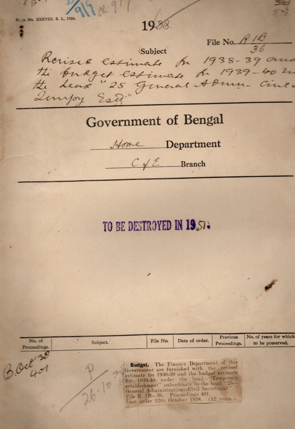 | Rack No. 08, Bundle No. 06, SI No. 338 Assembly question by Miss P. Bell Hart. M.L.A. regarding removal of disqualification of certain candidates for election. | Rack No. 08, Bundle No. 06, SI No. 339 Regularization of excess expenditure under the head “Pay of establishment” of the Legislative Assembly Department during 1937-38. | Rack No. 08, Bundle No. 06, SI No. 340 Estimate of schedules caste voters for the provincial upper chamber. | Rack No. 08, Bundle No. 06, SI No. 341 Revised estimate for 1938-39 & the budget estimate for 1939-40 under the head “25 General Administration Civil Secretariat”. | Rack No. 08, Bundle No. 06, SI No. 342 Amendment to the fundamental & Subsidiary Rules. | Rack No. 08, Bundle No. 06, SI No. 343 Instruction regarding the sending of advertisement to the Director of Public information. | Rack No. 08, Bundle No. 06, SI No. 344 Pay of Babu Ballal Behari Dey, Typist Bengal legislative Assembly Department which performing the duties of care taker in addition. |
