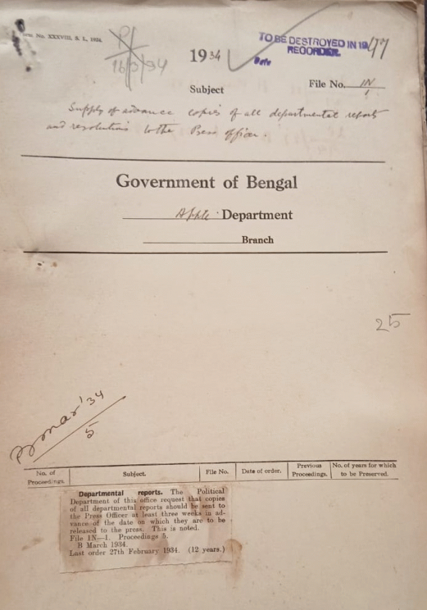 | Rack No. 2, Bundle No. 04, Sl No. 222 Joining time of Molvi. Muhammad A. Khaleque Sub-Deputy. Collector, Khulna. | Rack No. 2, Bundle No. 04, Sl No. 223 Transfer and posting of the Military Intelligence officers attached to several districts as Additional Superintendent of Police. | Rack No. 2, Bundle No. 04, Sl No. 224 House accommodation of the R.E. Lee. Presidency Senior Captain. | Rack No. 2, Bundle No. 04, Sl No. 225 Supply of advance copies of all department reports to the press officer. | Rack No. 2, Bundle No. 04, Sl No. 226 Powers of Babu Bijoy Kumar Bhattacharjee Sub-Deputy's Magistrate Kushtia. | Rack No. 2, Bundle No. 04, Sl No. 227 Investment of officiating subordinate Judge with the powers of an Assistant Seniors Judge. | Rack No. 2, Bundle No. 04, Sl No. 228 Arrangements in the place of M/S. K.C. Char, I.C.S and S. Sen I.C.S. appointment on the supplementary Tribunal. |