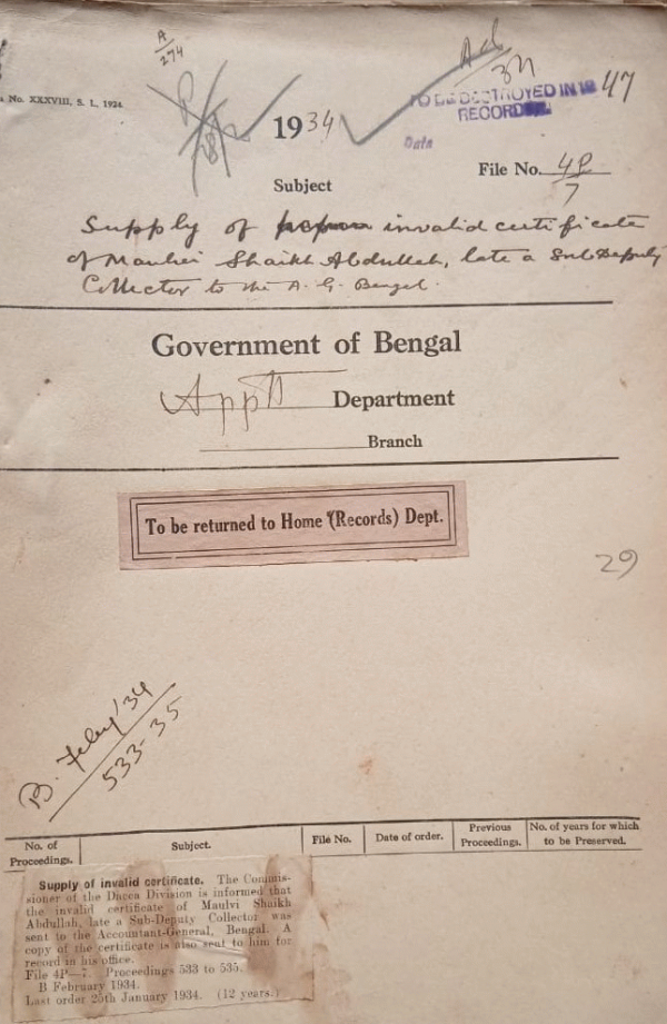 Supply of invalid certificates of Molvi. Shaikat Abdullah, Late a Sub-Deputy Collector to the A.G., Bengal.