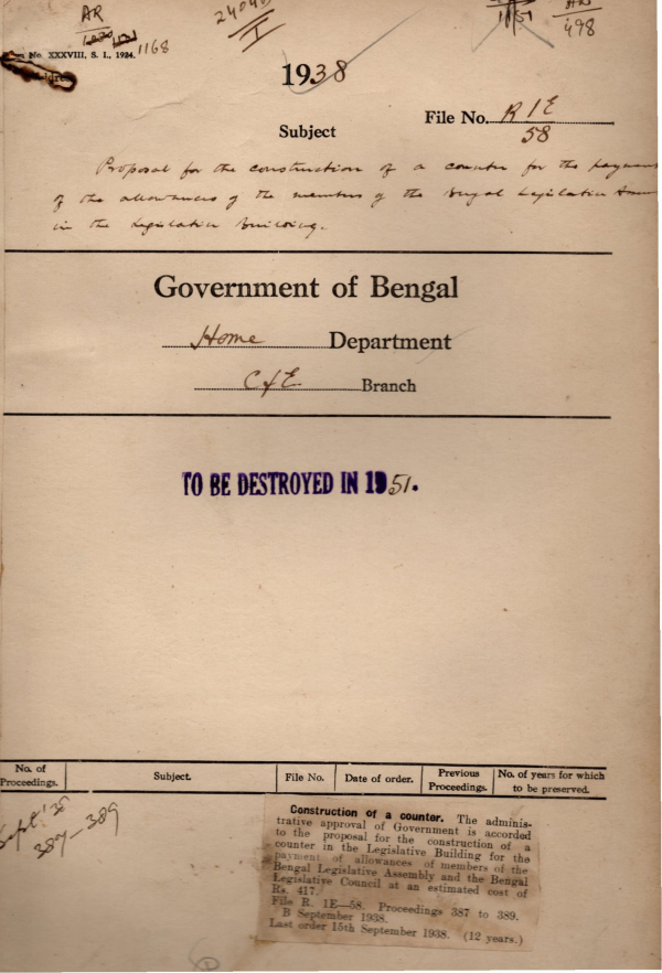Proposal for the construction of a counter for the payment of the allowance of the member of the Bengal legislative assembly in the legislative Building.