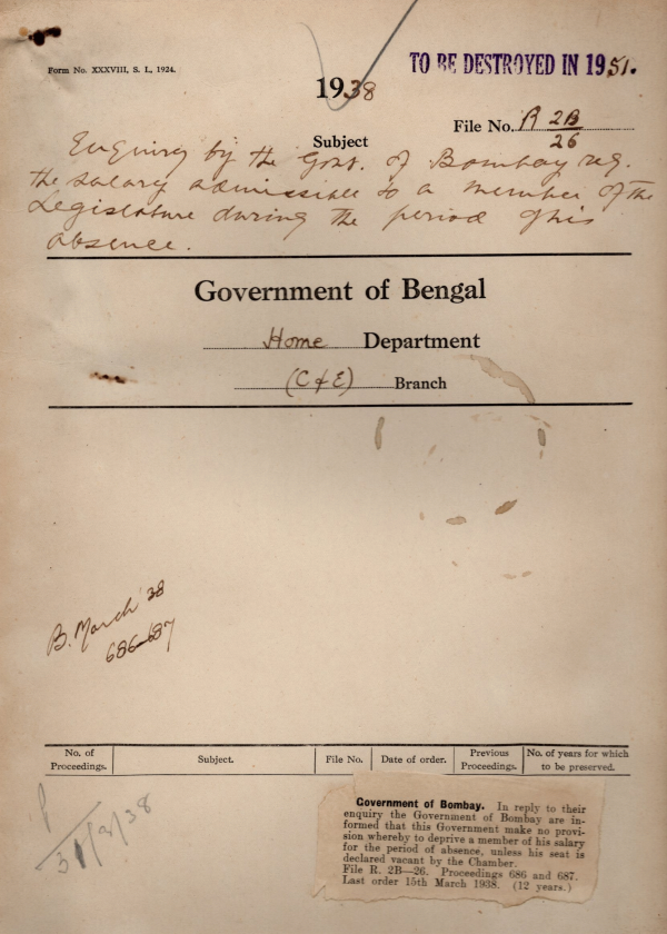 | Rack No. 08, Bundle No. 06, SI No. 359 Motion by Mr. Lalit Chandra Das M.L.A. regarding the introduction of part II of the Govt. of India Act 1935. | Rack No. 08, Bundle No. 06, SI No. 360 Replacement of the office telephone set of the Secretary B.L.A. by one Hand Micro Telephone Set. | Rack No. 08, Bundle No. 06, SI No. 361 Requirement in respect of spare copies of all printed documents of the Govt. of India. | Rack No. 08, Bundle No. 06, SI No. 362 Provision of salaries & allowance of members of the Provincial legislature. | Rack No. 08, Bundle No. 06, SI No. 363 Allocation of a scheduled caste seat to the Rajshahi district resolution passed at the Rajshahi District depend class association. | Rack No. 08, Bundle No. 06, SI No. 364 Resolution of by Dr. N. Sanyal M.L.A. regarding the replacement of the existing constitution. | Rack No. 08, Bundle No. 06, SI No. 365 Fixating a swing door in the room of the Registrar, B.L.C. |