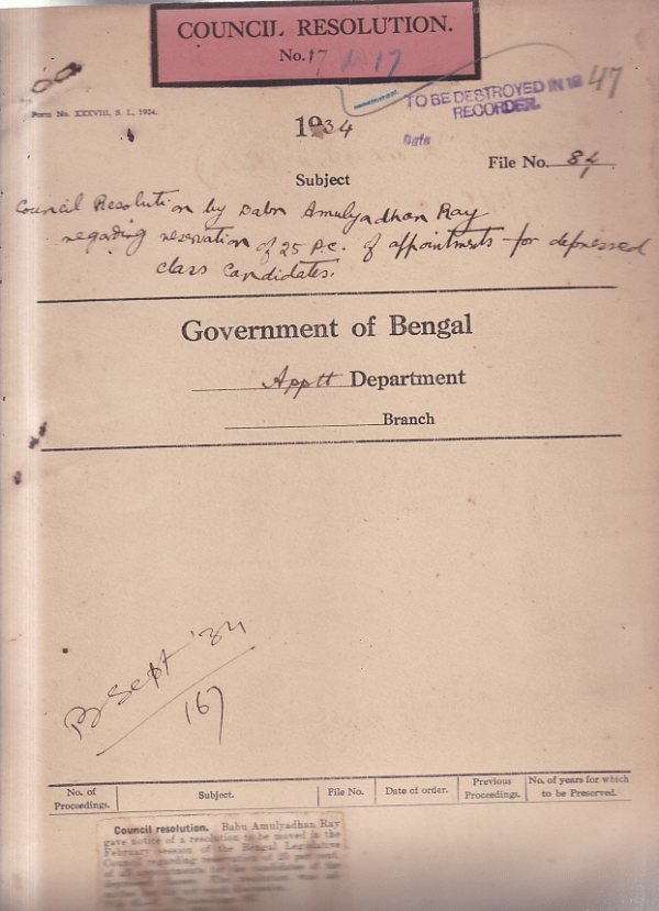 Council resolution by Bable A. Ray regarding reservation of 25 percent appointments for the candidates of the depressed classes.