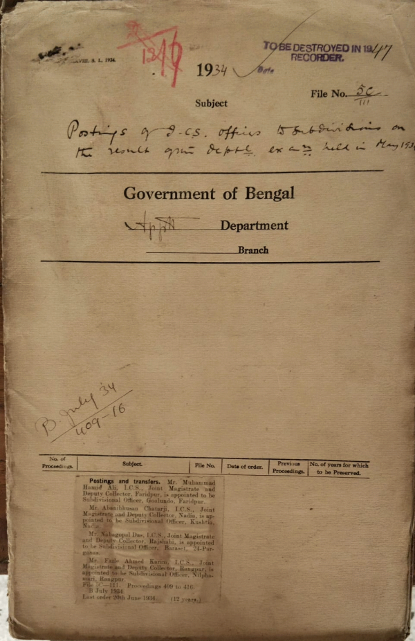 | Rack No. 2, Bundle No. 9, Sl No. 554 Appointment of a Special Tribunal at Dacca. | Rack No. 2, Bundle No. 9, Sl No. 555 Application of Babu Arjya Kumar Sen for admission to the Indian Police Examination. | Rack No. 2, Bundle No. 9, Sl No. 556 Application of Babu Paresh Chandra Gupta for admission to the Indian Police Examination. | Rack No. 2, Bundle No. 9, Sl No. 557 Postings of I.C.S. officers to Sub-Division on the resent of the department Examination held on May, 1934. | Rack No. 2, Bundle No. 9, Sl No. 558 Application of Mr. M.K.K. Kirpalani I.C.S. as session Judge, Bakarganj. | Rack No. 2, Bundle No. 9, Sl No. 559 Table of marks obtained by the I.P. candidates for Bengal in 1933. | Rack No. 2, Bundle No. 9, Sl No. 560 Posting of Mr. J.H.C. Cowguli A.S.P. on leave of Rajshahi. |