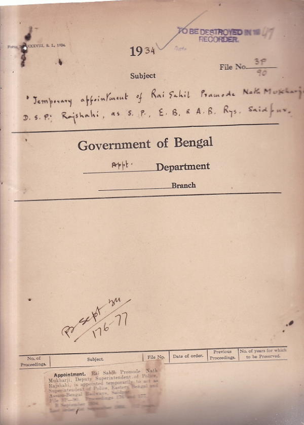 Temporary appointment of Rai Sahib promode Nath Mukharji D.S.P. Rajshahi.