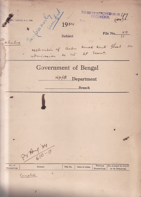 | Rack No. 02, Bundle No. 14, Sl No. 881 Transfer of work in connection with public health from education secretary to. L.S.G. | Rack No. 02, Bundle No. 14, Sl No. 882 General provident fund (Central Service) Rules. | Rack No. 02, Bundle No. 14, Sl No. 883 Temporary appointment of Rai Sahib promode Nath Mukharji D.S.P. Rajshahi. | Rack No. 02, Bundle No. 14, Sl No. 884 Appointment of B.K. Nath Ghost for admission to the I.P. Examination | Rack No. 02, Bundle No. 14, Sl No. 885 Establishment of temporary clerk sanctioned for Howrah and Bakarganj Collect orates for work. | Rack No. 02, Bundle No. 14, Sl No. 886 Establishment of temporary clerk sanctioned for Howrah and Bakarganj Collect orates for work. | Rack No. 02, Bundle No. 14, Sl No. 887 Appointment of Babu Kamalaksha Mitra for admission to the I.P. Exam. |