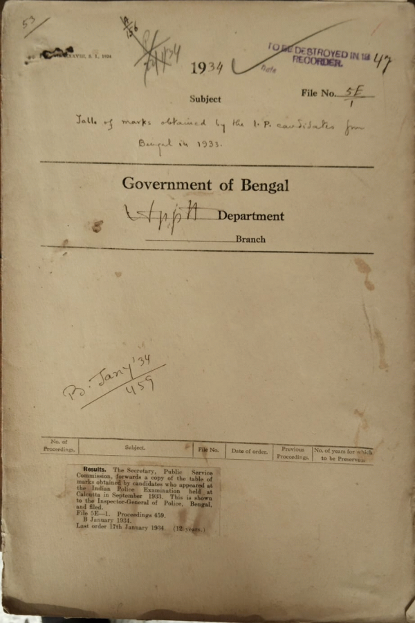 | Rack No. 2, Bundle No. 9, Sl No. 556 Application of Babu Paresh Chandra Gupta for admission to the Indian Police Examination. | Rack No. 2, Bundle No. 9, Sl No. 557 Postings of I.C.S. officers to Sub-Division on the resent of the department Examination held on May, 1934. | Rack No. 2, Bundle No. 9, Sl No. 558 Application of Mr. M.K.K. Kirpalani I.C.S. as session Judge, Bakarganj. | Rack No. 2, Bundle No. 9, Sl No. 559 Table of marks obtained by the I.P. candidates for Bengal in 1933. | Rack No. 2, Bundle No. 9, Sl No. 560 Posting of Mr. J.H.C. Cowguli A.S.P. on leave of Rajshahi. | Rack No. 23, Bundle No. 82, Sl No. 6866 Proposal for Sanction the amount of Rs. 2000/- from the N.S. Fund for payment to the Ansars of Chittagong Port. |