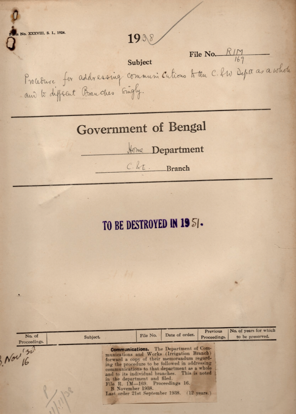 | Rack No. 08, Bundle No. 06, SI No. 367 Economy in printing confidential files strict conformation of Sec. 384 of Secretariat Instructions, 1924. | Rack No. 08, Bundle No. 06, SI No. 368 Move of the B.L.A. & B.L.C. Departments to Darjeeling’s. | Rack No. 08, Bundle No. 06, SI No. 369 Budget Calendar for 1939-40. | Rack No. 08, Bundle No. 06, SI No. 370 Procedure for addressing communications to the C&W Department as a whole & two different branches. | Rack No. 08, Bundle No. 07, SI No. 371 Submission of return of election expenses Mrs. E. West elected to the Bengal legislative Assembly from the Anglo-Indian Constituency. | Rack No. 08, Bundle No. 07, SI No. 372 Expenditure in connection with the Indirect election to the Bengal legislative Council. | Rack No. 08, Bundle No. 07, SI No. 373 Procedure for circulation of Bills for opinion of the local officers. |