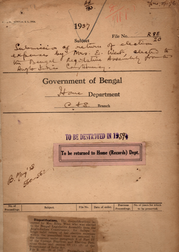 Submission of return of election expenses Mrs. E. West elected to the Bengal legislative Assembly from the Anglo-Indian Constituency.