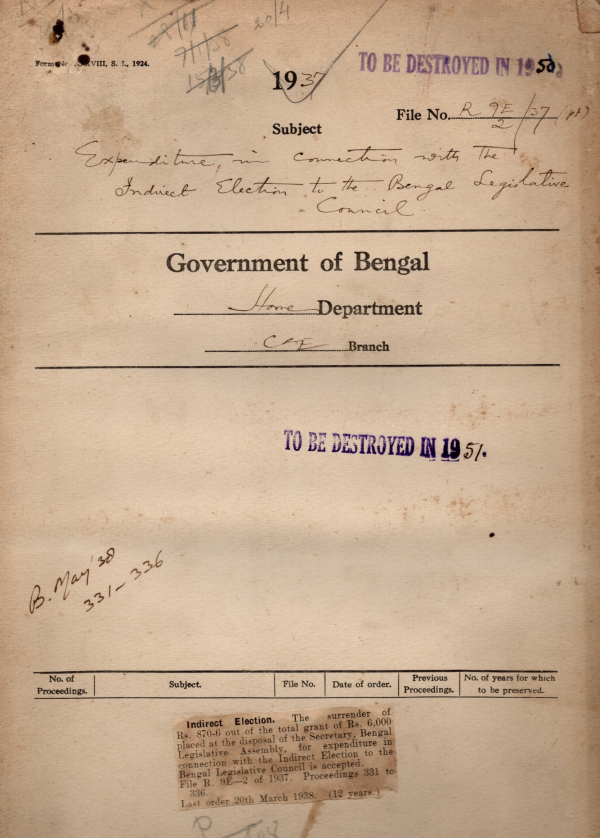 | Rack No. 08, Bundle No. 06, SI No. 369 Budget Calendar for 1939-40. | Rack No. 08, Bundle No. 06, SI No. 370 Procedure for addressing communications to the C&W Department as a whole & two different branches. | Rack No. 08, Bundle No. 07, SI No. 371 Submission of return of election expenses Mrs. E. West elected to the Bengal legislative Assembly from the Anglo-Indian Constituency. | Rack No. 08, Bundle No. 07, SI No. 372 Expenditure in connection with the Indirect election to the Bengal legislative Council. | Rack No. 08, Bundle No. 07, SI No. 373 Procedure for circulation of Bills for opinion of the local officers. | Rack No. 08, Bundle No. 07, SI No. 374 Revision and preparation of the electoral Rolls for the Indian legislative Assembly. | Rack No. 08, Bundle No. 07, SI No. 375 Further retention of the temporary staff employed in the Chittagong Collectorate for election work. |