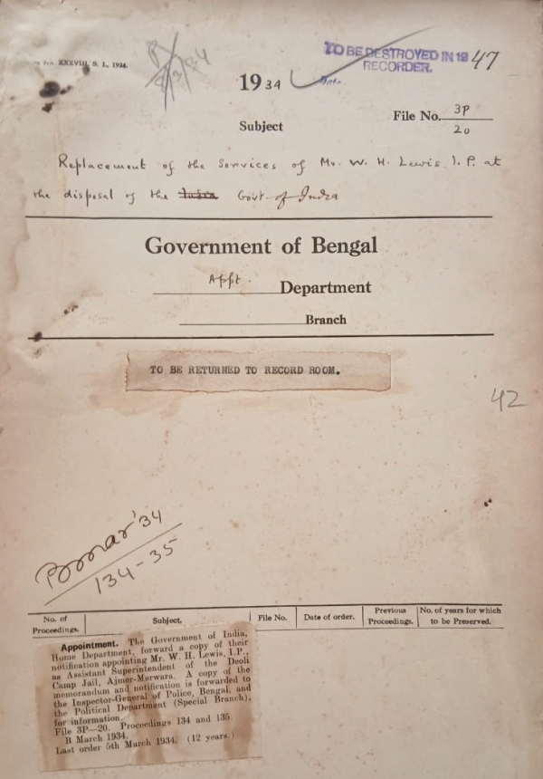 Replacement of the services of Mv. W.H. Lewis. I.P. at the disposal of the Governmentof India.