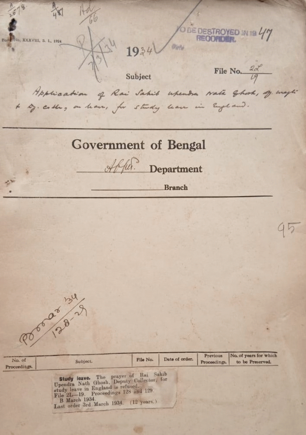 Appointment of Rai Shahib upendra Nath Ghosh. Deputy Magistrate & Deputy. Collector for stu Deputy tour in England.