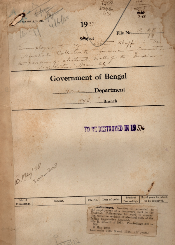 | Rack No. 08, Bundle No. 07, SI No. 371 Submission of return of election expenses Mrs. E. West elected to the Bengal legislative Assembly from the Anglo-Indian Constituency. | Rack No. 08, Bundle No. 07, SI No. 372 Expenditure in connection with the Indirect election to the Bengal legislative Council. | Rack No. 08, Bundle No. 07, SI No. 373 Procedure for circulation of Bills for opinion of the local officers. | Rack No. 08, Bundle No. 07, SI No. 374 Revision and preparation of the electoral Rolls for the Indian legislative Assembly. | Rack No. 08, Bundle No. 07, SI No. 375 Further retention of the temporary staff employed in the Chittagong Collectorate for election work. | Rack No. 08, Bundle No. 07, SI No. 376 Vote for Revising officers appointed for the further of the day’s electoral rolls of the Indian legislative Assembly. | Rack No. 08, Bundle No. 07, SI No. 377 Notes regarding the Subonatum of legislative and Judicial Department. |