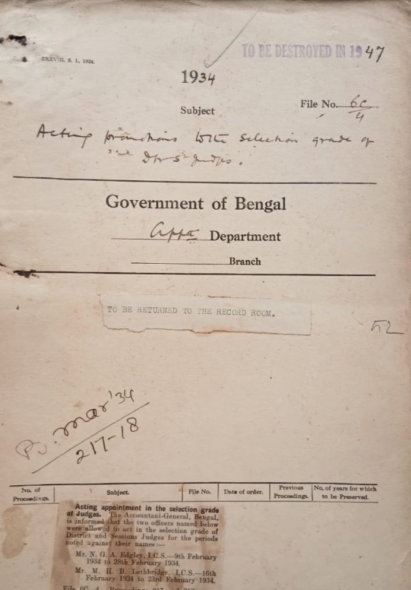 | Rack No. 2, Bundle No. 04, Sl No. 249 Promotion of certain Deputy Magistrate and Deputy Collectors above the lower efficiency bar. | Rack No. 2, Bundle No. 04, Sl No. 250 Second class powers of member Mahammad Keyamuddin Ahmad, Sub-Deputy Collector, Mymensingh. | Rack No. 2, Bundle No. 04, Sl No. 251 Retirement of Mr. J.W. Nelson, I.C.S. (Judges). | Rack No. 2, Bundle No. 04, Sl No. 252 Acting promotions to the selection grade of Judges. | Rack No. 2, Bundle No. 04, Sl No. 253 Appointment of captain J. Mc. L.W. Titley R.A. as a Military intelligence officer in the D.I.B. Rangpur. | Rack No. 2, Bundle No. 04, Sl No. 254 Extension of leave of Rai Amal Krishna Mukherji Bahadur Preparatory to retirement. | Rack No. 2, Bundle No. 04, Sl No. 255 Audit of accounts of the Christian Burial Board 1932-33. |