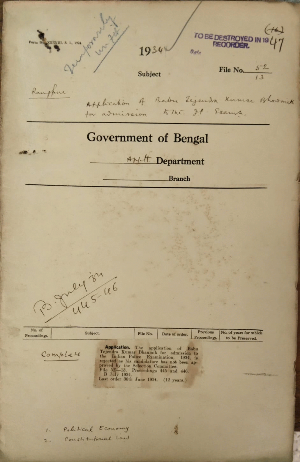 | Rack No. 2, Bundle No. 10, Sl No. 570 Application of Babu B.B. Banarji for admission to the Indian Police Examination | Rack No. 2, Bundle No. 10, Sl No. 571 Application of Mr. K. Subrahmanian for admission to the Indian Police Examination | Rack No. 2, Bundle No. 10, Sl No. 572 Application of Maulvi. A.N. Nurul Huda for admission to the Indian Police Exam. | Rack No. 2, Bundle No. 10, Sl No. 573 Application of Babu T.K. Bhaumik for admission to the Indian Police Exam. | Rack No. 2, Bundle No. 10, Sl No. 574 Application of Maulvi K.I.M. Golam for admission to the Indian Police Exam. | Rack No. 2, Bundle No. 10, Sl No. 575 Application of Babu R.N. Ghosh for admission to the Indian Police Exam. | Rack No. 2, Bundle No. 10, Sl No. 576 Application of Babu U.K. Mukharji for admission to the Indian Police Exam. |