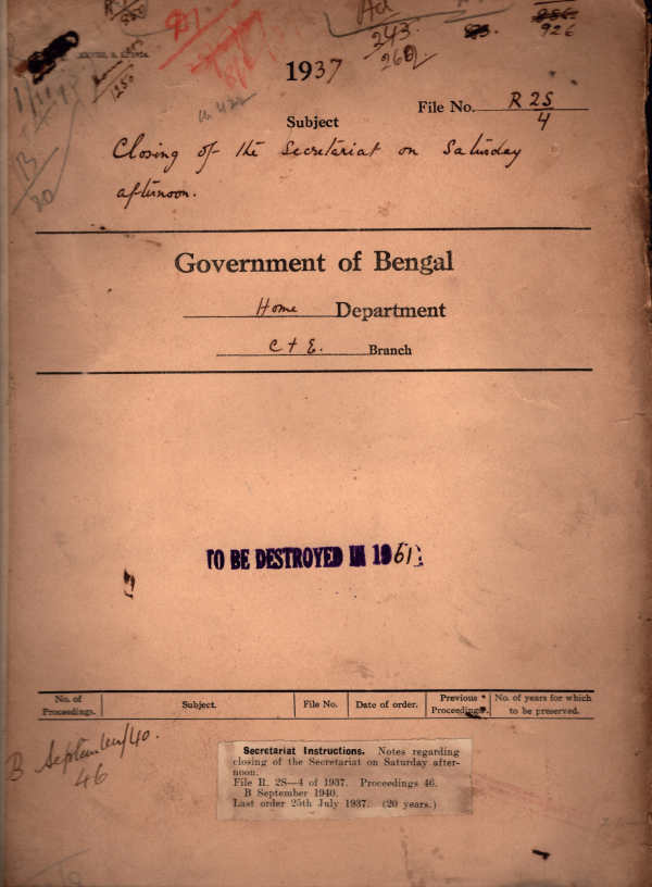 | Rack No. 08, Bundle No. 15; SI No. 902 Interpretation of Section 121 of the Bengal legis. Assembly Rules and standing orders. | Rack No. 08, Bundle No. 15; SI No. 903 Palling Schemes. (Paragraph 20 of C.T.O. No. 5128-32 A.R. d 26.2.37). | Rack No. 08, Bundle No. 15; SI No. 904 Revision of Secretariat Instructions (Sec. 109 (J) and 193 regarding preparation of table slips.) | Rack No. 08, Bundle No. 15; SI No. 905 Closing of the secularist on Saturday afternoon. | Rack No. 08, Bundle No. 15; SI No. 906 Meeting of the Cabinet Committee to Consider draft rules of Procedure for the legislature under Section 84 (i) of the Govt. of India Act, 1935. | Rack No. 08, Bundle No. 15; SI No. 907 Statement showing Expenditure incurred in connection with the revision of Electoral rolls for the Indian legislative Assembly 1937-38. | Rack No. 08, Bundle No. 15; SI No. 908 Selection of Candidates for Appointment Secretary and Register, Bengal Department. |