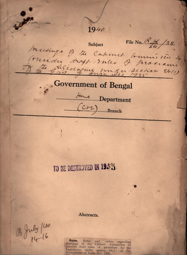| Rack No. 08, Bundle No. 15; SI No. 903 Palling Schemes. (Paragraph 20 of C.T.O. No. 5128-32 A.R. d 26.2.37). | Rack No. 08, Bundle No. 15; SI No. 904 Revision of Secretariat Instructions (Sec. 109 (J) and 193 regarding preparation of table slips.) | Rack No. 08, Bundle No. 15; SI No. 905 Closing of the secularist on Saturday afternoon. | Rack No. 08, Bundle No. 15; SI No. 906 Meeting of the Cabinet Committee to Consider draft rules of Procedure for the legislature under Section 84 (i) of the Govt. of India Act, 1935. | Rack No. 08, Bundle No. 15; SI No. 907 Statement showing Expenditure incurred in connection with the revision of Electoral rolls for the Indian legislative Assembly 1937-38. | Rack No. 08, Bundle No. 15; SI No. 908 Selection of Candidates for Appointment Secretary and Register, Bengal Department. | Rack No. 08, Bundle No. 15; SI No. 909 Revision of Chapter IX of the Secretariat Instructions. |