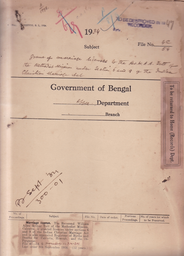 Grant of marriage license to the Rev. W. A.A. Tutt of the Methodist Mission, Calcutta.