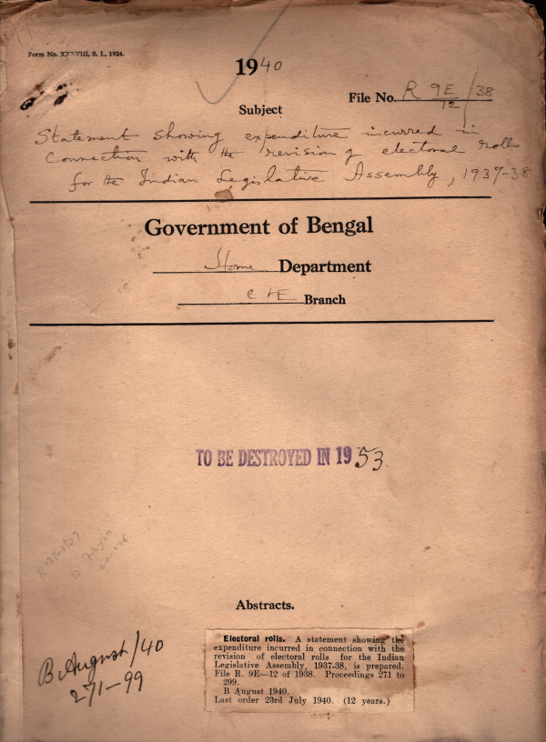 | Rack No. 08, Bundle No. 15; SI No. 904 Revision of Secretariat Instructions (Sec. 109 (J) and 193 regarding preparation of table slips.) | Rack No. 08, Bundle No. 15; SI No. 905 Closing of the secularist on Saturday afternoon. | Rack No. 08, Bundle No. 15; SI No. 906 Meeting of the Cabinet Committee to Consider draft rules of Procedure for the legislature under Section 84 (i) of the Govt. of India Act, 1935. | Rack No. 08, Bundle No. 15; SI No. 907 Statement showing Expenditure incurred in connection with the revision of Electoral rolls for the Indian legislative Assembly 1937-38. | Rack No. 08, Bundle No. 15; SI No. 908 Selection of Candidates for Appointment Secretary and Register, Bengal Department. | Rack No. 08, Bundle No. 15; SI No. 909 Revision of Chapter IX of the Secretariat Instructions. | Rack No. 08, Bundle No. 15; SI No. 910 Question whether name of Nawab Sir K.G.M. Faroqui and Should be included in the electoral roll of the Indian legislative Assembly under preparation |