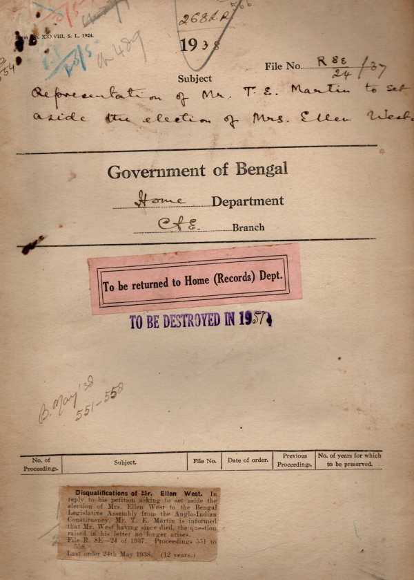 | Rack No. 08, Bundle No. 07, SI No. 394 Rate of washing allowance to liveried menials. | Rack No. 08, Bundle No. 07, SI No. 395 Exchange of official publications between the govt. of Bombay and Bengal on a reciprocal basis. | Rack No. 08, Bundle No. 07, SI No. 396 Financial powers of officer to sanction purchase of stores for the Public Service. | Rack No. 08, Bundle No. 07, SI No. 397 Representation of Mr. T.E. Martin to set aside the election of Mrs. E.W. | Rack No. 08, Bundle No. 07, SI No. 398 Supply of from of return of election expenses to the Additional Sadar S.D.O. Chittagong. | Rack No. 08, Bundle No. 07, SI No. 399 Bye-election in the European constituency of the Bengal leg. Council resigned. | Rack No. 08, Bundle No. 07, SI No. 400 Amendments to the Bengal Service (Revision of pay) Rules, 1934. |