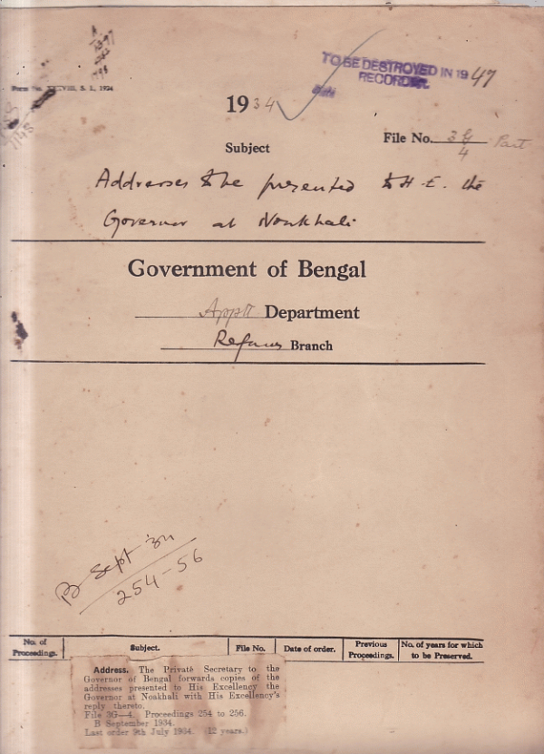 | Rack No. 02, Bundle No. 15, Sl No. 914 Death report of Babu Charan Chandra Chaterji, Sub-Deputy Collector. | Rack No. 02, Bundle No. 15, Sl No. 915 Proposed Surrender of a part of the Compound of Christ Chureh, Comilla. | Rack No. 02, Bundle No. 15, Sl No. 916 Application from Mrs. L. Prior widow of Mr. F.P. Prior widow of Mr. F.P. Prior I.P. Bengal, for the grant of a compassionate allowance. | Rack No. 02, Bundle No. 15, Sl No. 917 Addresses to the presented to H/E. the governor at Noakhali. | Rack No. 02, Bundle No. 15, Sl No. 918 Commutation table of pensions. | Rack No. 02, Bundle No. 15, Sl No. 919 List of officers in receipt of a permanent months T.A. | Rack No. 02, Bundle No. 15, Sl No. 920 Report of marriage of Mr. G. Rateliff, I.C.S., S.D.O. Narayanganj Dacca. |