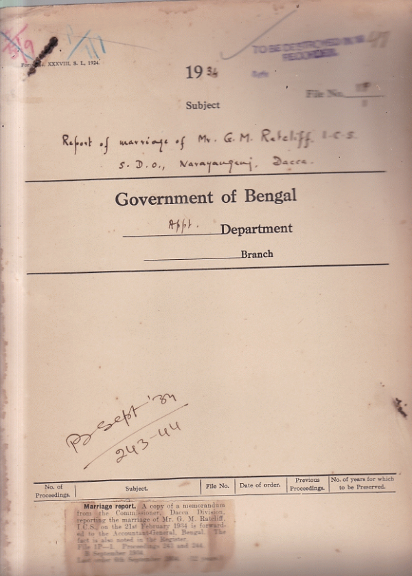 Report of marriage of Mr. G. Rateliff, I.C.S., S.D.O. Narayanganj Dacca.