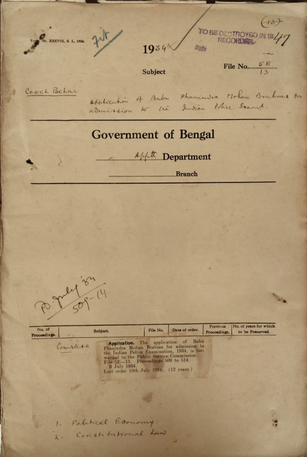 | Rack No. 2, Bundle No. 10, Sl No. 594 Application of Babu P.K. Ganguli for admission to the Indian Police Exam. | Rack No. 2, Bundle No. 10, Sl No. 595 Application of Babu P.M. Brahma for admission to the Indian Police Exam. | Rack No. 2, Bundle No. 10, Sl No. 596 Application of Babu Birendra Mohan Mukharji for admission to the Indian Police Exam. | Rack No. 2, Bundle No. 10, Sl No. 597 Application of Babu L.N. Sen for admission to the Indian Police Exam. | Rack No. 2, Bundle No. 10, Sl No. 598 Application of Maulvi Qazi Zeauddin Ahmed for admission to the Indian Police Exam. | Rack No. 2, Bundle No. 10, Sl No. 599 Application of Maulvi M.A. Salam for admission to the Indian Police Exam. | Rack No. 2, Bundle No. 10, Sl No. 600 Application of Maulvi Sher Ali Khan for admission to the Indian Police Exam. |