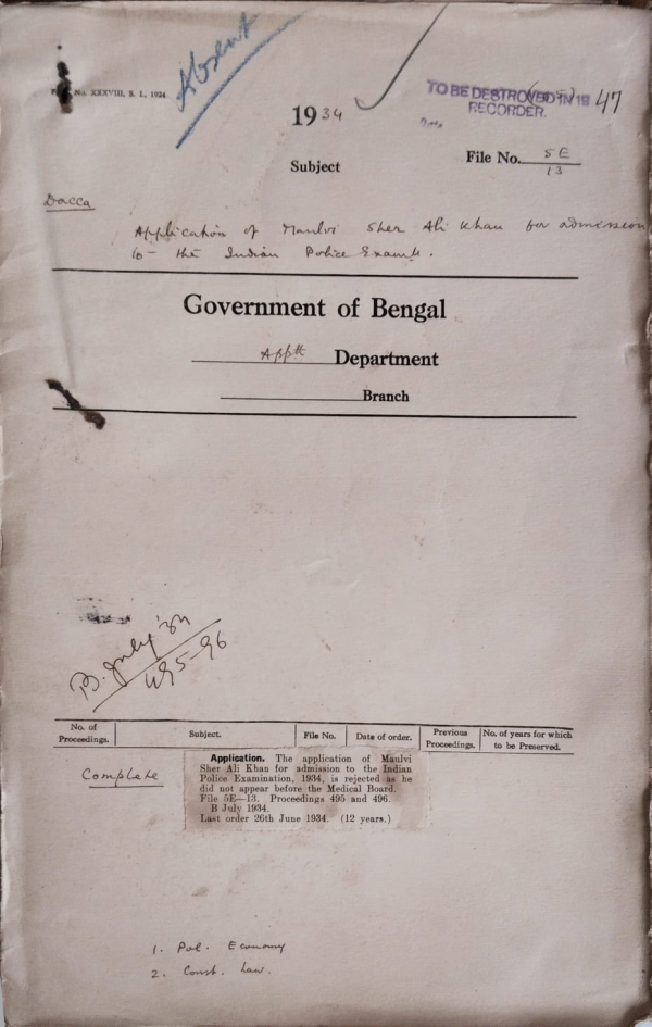 | Rack No. 2, Bundle No. 10, Sl No. 599 Application of Maulvi M.A. Salam for admission to the Indian Police Exam. | Rack No. 2, Bundle No. 10, Sl No. 600 Application of Maulvi Sher Ali Khan for admission to the Indian Police Exam. | Rack No. 2, Bundle No. 10, Sl No. 601 Application of Babu Arun Chandra Das Gupta for admission to the Indian Police Exam. | Rack No. 2, Bundle No. 10, Sl No. 602 Application of Babu Kanal Lal Ghosh for admission to the Indian Police Exam. | Rack No. 2, Bundle No. 10, Sl No. 603 Application of Babu S.K. Banarji for admission to the Indian Police Exam. | Rack No. 2, Bundle No. 10, Sl No. 604 Application of Babu Binoy Krishna Lal for admission to the Indian Police Exam. | Rack No. 2, Bundle No. 10, Sl No. 605 Application of Maulvi Mazharul Huq for admission to the Indian Police Exam. |