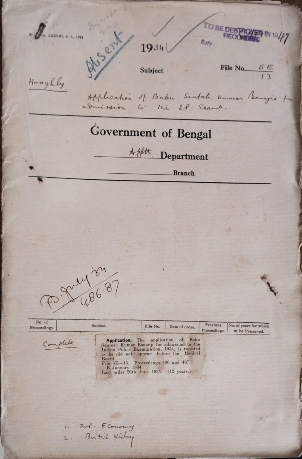 | Rack No. 2, Bundle No. 10, Sl No. 602 Application of Babu Kanal Lal Ghosh for admission to the Indian Police Exam. | Rack No. 2, Bundle No. 10, Sl No. 603 Application of Babu S.K. Banarji for admission to the Indian Police Exam. | Rack No. 2, Bundle No. 10, Sl No. 604 Application of Babu Binoy Krishna Lal for admission to the Indian Police Exam. | Rack No. 2, Bundle No. 10, Sl No. 605 Application of Maulvi Mazharul Huq for admission to the Indian Police Exam. | Rack No. 2, Bundle No. 10, Sl No. 606 Application of Babu Nirmal Chandra Mukharji for admission to the Indian Police Exam. | Rack No. 2, Bundle No. 10, Sl No. 607 Application of Maulvi Najabuddin Ahmed for admission to the Indian Police Exam. | Rack No. 2, Bundle No. 10, Sl No. 608 Application of Maulvi S.Q. Ali for admission to the Indian Police Exam. |