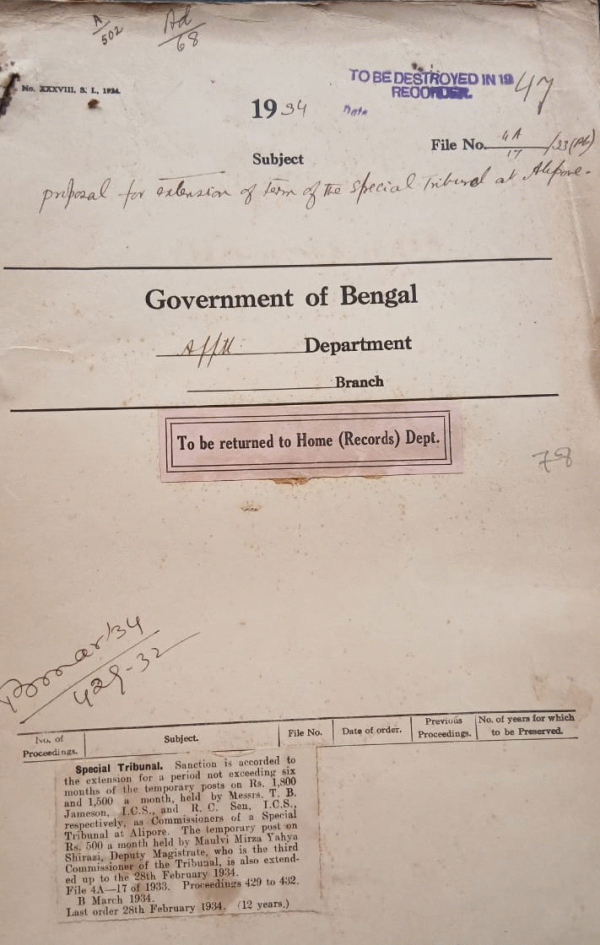 | Rack No. 2, Bundle No. 05, Sl No. 275 Report on the progress made in increasing the members of listed posts in the Indian Police during the year 1933. | Rack No. 2, Bundle No. 05, Sl No. 276 Report of a birth a daughter to Hubert Graham I.C.S. Deputy Commissioner Jalpaiguri. | Rack No. 2, Bundle No. 05, Sl No. 277 House of allowance of Maulvi A. Majid Khondhkar Sub-Deputy collector and Civil officer | Rack No. 2, Bundle No. 05, Sl No. 278 Proposal for extension of the special tribunal at Alipore. | Rack No. 2, Bundle No. 05, Sl No. 279 House allowances of Maulvi. Abdul Majid Khondkar Sub. Deputy Collector and Civil Officer. | Rack No. 2, Bundle No. 05, Sl No. 280 Extension of leave Altafur Rahman Khan Deputy Magistrate and Deputy Collector. | Rack No. 2, Bundle No. 05, Sl No. 281 Appointment of Mr. Rabindra Nath Roy a Deputy Collector for two year employee. |
