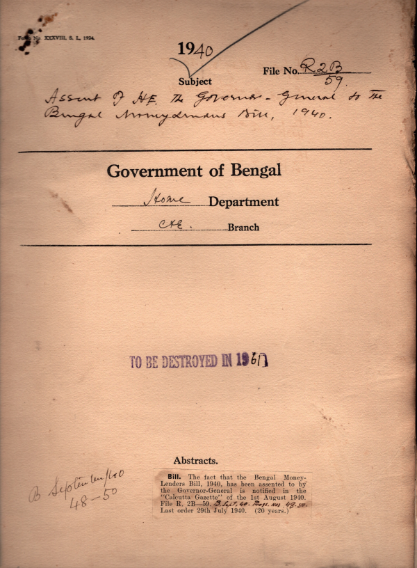 Assent of H.E. the Governor, general to the Bengal Money Lenders Bill, 1940.