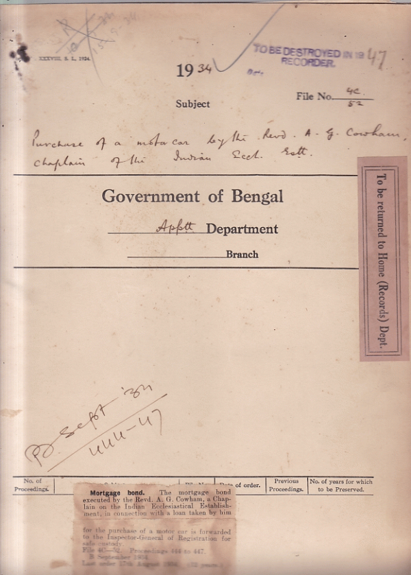 | Rack No. 02, Bundle No. 15, Sl No. 934 Debarring from obtaining employment under govt. | Rack No. 02, Bundle No. 15, Sl No. 935 Representation of the Bengal Mill Owners Association in Legislatures. | Rack No. 02, Bundle No. 15, Sl No. 936 Application of Mr. H.C.V. Philpot, I.C.S. for retirement on proportionate pension. | Rack No. 02, Bundle No. 15, Sl No. 937 Purchase of a motor car by the Rev. A.G. Cowhan, Captain of the Indian. | Rack No. 02, Bundle No. 15, Sl No. 938 Restoration of the name of Babu Birendra Nath Chandra Sen Gupta Sessionion & District Judges. | Rack No. 02, Bundle No. 15, Sl No. 939 Meeting between I.C.S. probations and Home and officers. | Rack No. 02, Bundle No. 15, Sl No. 940 Grant of an advance from I.C.S. P.F. to Mr. H.G. Weight, I.C.S. District& Sessionion Judge, Midnapore. |