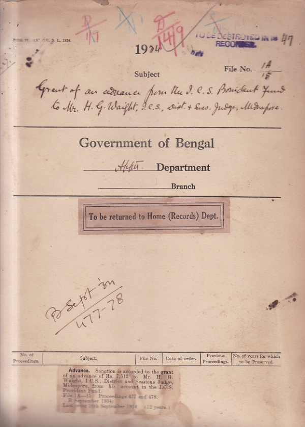 Grant of an advance from I.C.S. P.F. to Mr. H.G. Weight, I.C.S. District& Sessionion Judge, Midnapore.