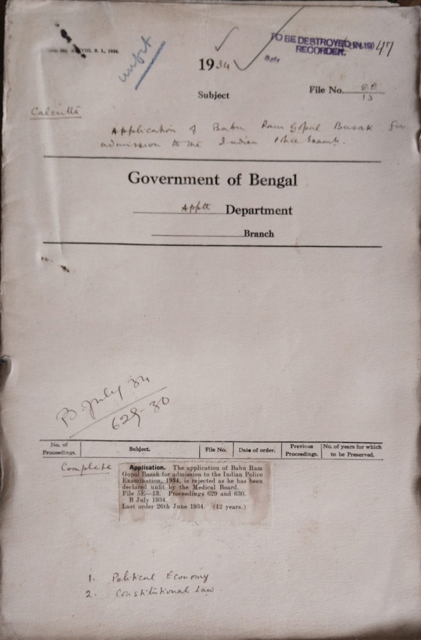 | Rack No. 2, Bundle No. 10, Sl No. 611 Application of Babu B.C. Das for admission to the Indian Police Exam. | Rack No. 2, Bundle No. 10, Sl No. 612 Application of P.K. Bardhan for admission to the Indian Police Exam. | Rack No. 2, Bundle No. 10, Sl No. 613 Application of Babu Ram Gopal Basak for admission to the Indian Police Exam. | Rack No. 2, Bundle No. 10, Sl No. 614 Application of Babu N.R. Mukharji for admission to the Indian Police Exam. | Rack No. 2, Bundle No. 10, Sl No. 615 Application of Maulvi A.K.M. Shamsul Islam for admission to the Indian Police Exam. | Rack No. 2, Bundle No. 10, Sl No. 616 Application of S.N. Das Gupta for admission to the Indian Police Exam. | Rack No. 2, Bundle No. 10, Sl No. 617 Application of Babu Niroj Chandra Haldar for admission to the Indian Police Exam. |